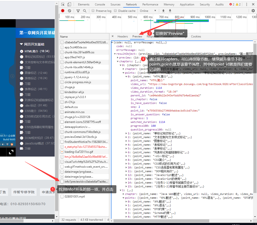 通过展开下面的菜单(JSON数据)可以得到各个视频的pointID这个pointID接下来会有用